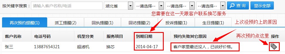 如下图中的描述,列表中的信息会明确告诉您,上次是什么原因没有预约上、下次什么时候在与客户联系。点击操作栏的“再次预约”,可进入此客户相关预约页面,再次与客户确定服务时间和安排派工。