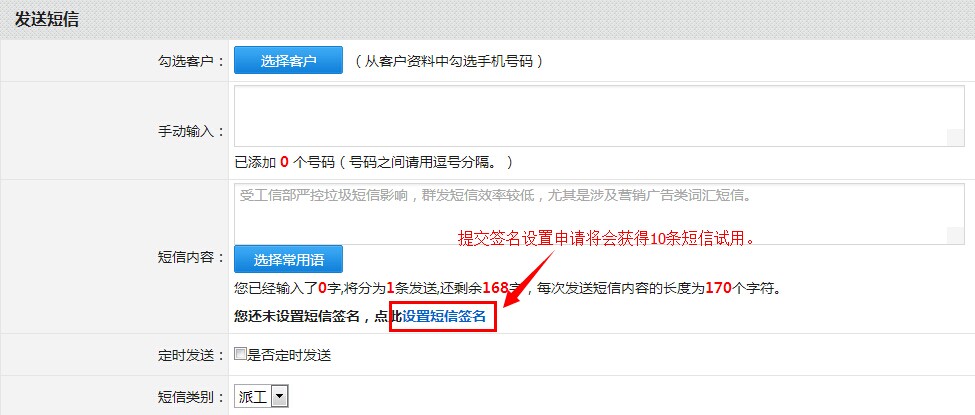 在购买短信前,您可以在短信发送页面通过设置签名来获得10条短信试用,如下图: