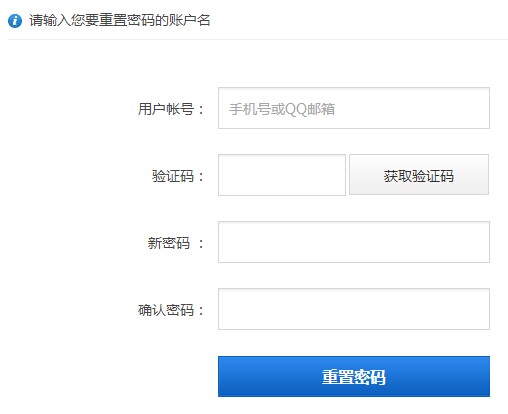 输入您注册时的手机号码或邮箱,点击获“取验证码”,系统会自动将一段6位随机数发送到您的手机或邮箱内,收到信息后,请将6位随机数填入验证码输入框,并填写两遍同样的新密码后点击“重置密码”即可进入系统开始使用。重置后以前所使用的密码会直接被新密码替换。