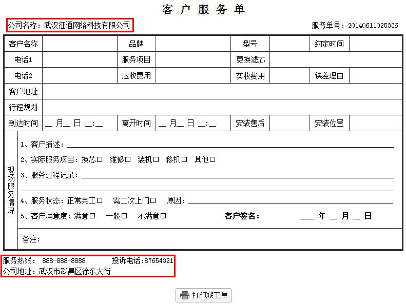 上图中被加粗字体的信息保存后将会自动引用到《派工服务单》上,如下图多联派工单样式中的:公司名称、服务热线、投诉电话和公司地址信息都是上图页面中的内容。如何科学规范派工服务?请查看“派工流程管理”帮助文章。